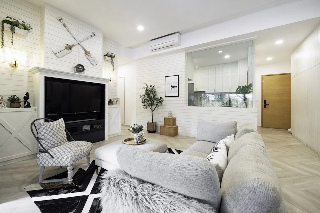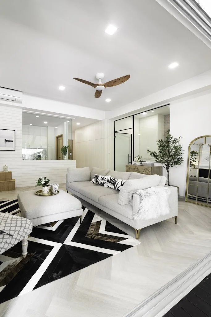 Though primarily white, the living room is nicely balanced with the very masculine and somewhat rustic cowhide carpet.