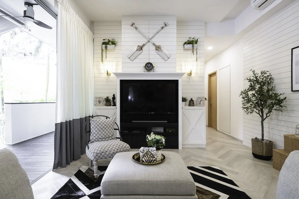 We especially LOVE the oars that anchor the living room. Not only are they decorative, they also serve as handles for the cabinet doors that are above our faux fireplace which we also ❤️.